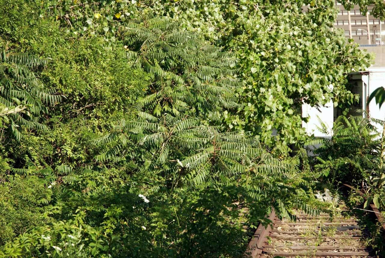 The above picture shows the High Line before it was converted to a park. The abandoned area was covered with Trees of Heaven (see the pinnate leaves in the center).